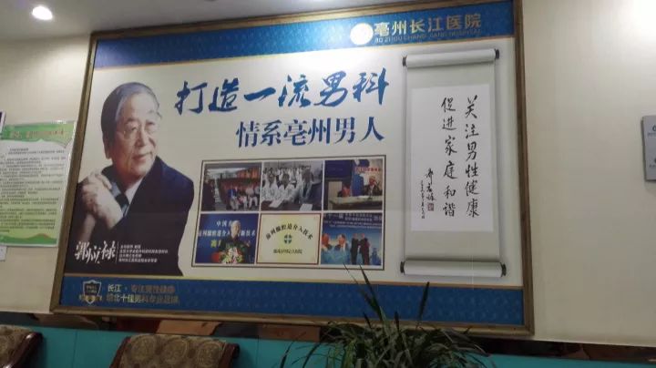 亳州長江醫院二樓男科診室外,掛著我國男科帶頭人郭應祿院士的照片和他們醫院的廣告語,而郭院士卻不認識他們
