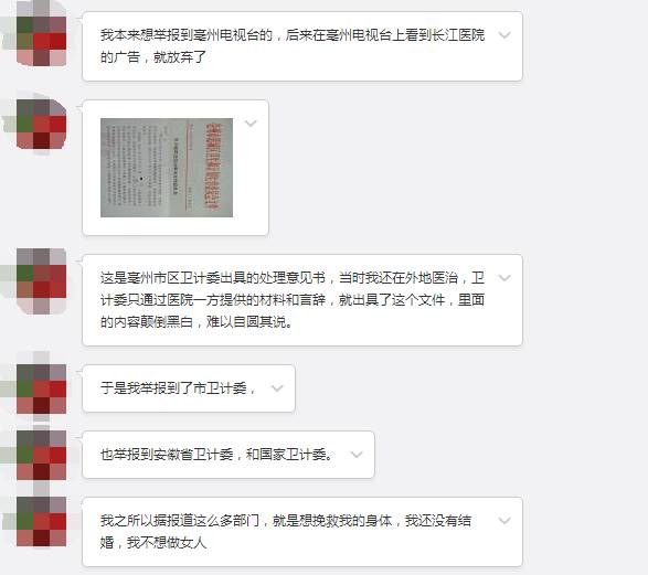 9月11日,亳州市譙城區衛生計生委受理了我的信訪。不過在9月22日簽發的處理意見書中,調查信息全部來自亳州長江醫院提供的材料,沒有征詢我的說法,和事實并不相符。